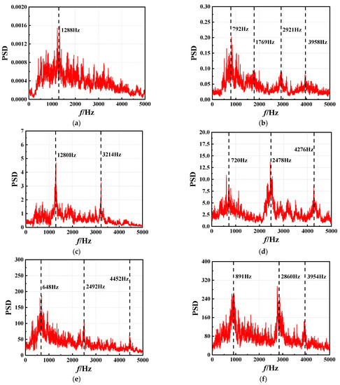 Power spectral density of pressure fluctuation at monitoring points: (a) Monitoring point 3; (b) Monitoring point 60; (c) Monitoring point 200; (d) Monitoring point 520; (e) Monitoring point 556; (f) Monitoring point 593.