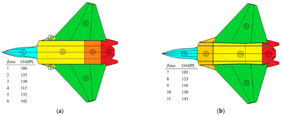 Acoustic zone maps were developed based on streamlined acoustic load predictions, CFD analysis, and empirical models. Figure 19 shows maps of the upper and lower acoustic zones. Regions of similar flow types and acoustic levels are colour-coded. The acoustic levels were not specifically predicted for the exhaust region in this study, but approximate estimates of the acoustic levels were developed based on the effective nozzle area and exit flow velocity. The variation ranges of the OASPL on the aircraft surface calculated by the empirical formula are 105 dB~143 dB, and the overall distribution law is consistent with the simulation results. However, the empirical formula method can only calculate the OASPL in areas with similar flows. At present, there are few flow types in the empirical formulas that cannot accurately characterise the distribution of acoustic load on the aircraft surface.