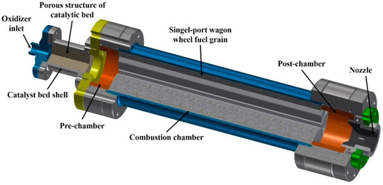 - Tian, H.; Jiang, X.; Yu, R.; Zhu, H.; Zhang, Y.; Cai, G. Numerical Analysis of the Hybrid Rocket Motor with Axial Injection Based on Oxidizer Flow Distribution. Acta Astronaut. 2022, 192, 245–257. [Google Scholar] [CrossRef]
