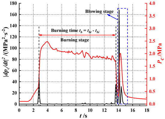 - The burning time of HRM : The burning time is the interval between the two peaks of the quadratic module of the time derivative of chamber pressure, which is described in detail below. The time is the moment corresponding to the first peak, and the time is the moment corresponding to the second peak.