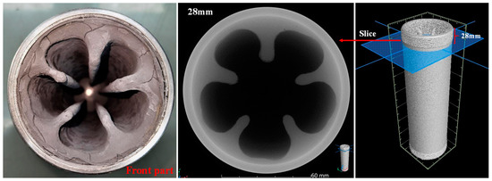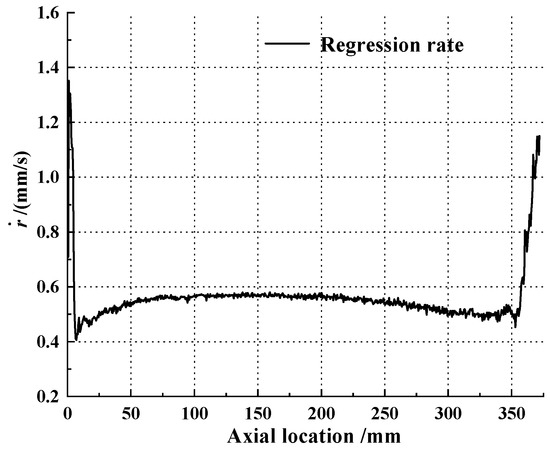 - The regression rate of each axial cross-section first plummeted and then gradually decreased with the increasing axial location, as characterized by CT scanning. The maximum regression rate, which occurred near the chamber head, was about 1.35 mm/s, and the average axial regression rate was 0.565 mm/s. Furthermore, the error in the average regression rate between CT scanning and the reconstruction calculation was only 1.91%, demonstrating that the reconstruction techniques provided a reliable method for characterizing the instantaneous regression rate using only a single firing test.