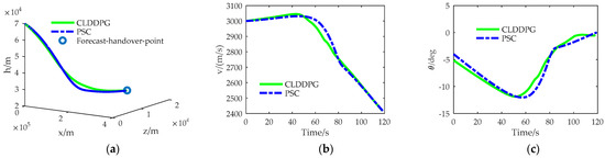 It can be seen from Figure 5 that the two optimized trajectories can meet the guidance requirements (see Figure 5a). The final speed of the two optimized trajectories are almost the same (see Figure 5b). Compared to the trajectory inclination angle (see Figure 5c), the difference in their trajectory deflection angle is greater (see Figure 5d), because their angle of attack changes have the same trend (see Figure 5e), the bank angle of the PSC trajectory has always been positive, while the bank angle of the CLPPDG trajectory is negative for a period of time in the later stage (see Figure 5f), which directly leads to a much larger increase in the trajectory deviation angle of PSC compared to CLDDPG. They can all meet the constraints of heat flux density (see Figure 5g), overload (see Figure 5h), and dynamic pressure (see Figure 5i), but the heat flux density of the PSC trajectory is relatively high, which is caused by the lower height of the PSC trajectory compared to the CLPPDG trajectory. It can be seen from Table 5 that the flight time of the CLPPDG trajectory is almost the same as that of the GPM optimized trajectory, but CLPPDG is far superior to PSC in the time required for optimizing the trajectory, which may benefit from CLPPDG’s extensive offline training experience. The simulation results show that the online planning method based on deep reinforcement learning proposed in this paper can not only generate a trajectory with good optimization performance online, but also have excellent real-time performance.