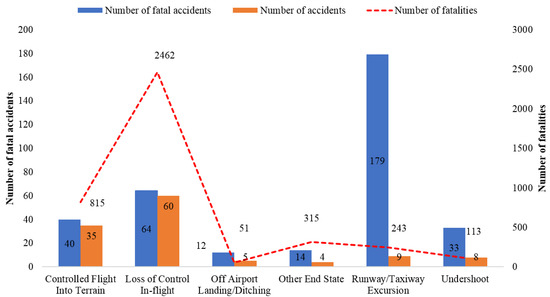 Since most LOC-I accidents result from airplane upsets, we have also analyzed the risk factors leading to LOC-I. IATA analyzed data on 64 LOC-I accidents from 2009 to 2018, which resulted in 2462 fatalities. The research results showed that in many cases the triggering factors of LOC-I accidents were the external environment, predominantly meteorological factors. However, pilots’ performance deficiencies often worsen the situation, making it difficult to recover until it was too late. In addition, insufficient training, inadequate safety management systems, and aircraft design defects were also considered potential threats that could lead to LOC-I accidents [10]. Jack Smith et al. [18] analyzed 46 general aviation LOC-I accidents in the UK from 2018 to 2019 based on the precursor sequence analysis model. The results showed that most non-fatal accidents were caused by inappropriate crew response after upsets, insufficient energy management, or improper procedures; fatal accidents were more likely to be irreparable due to dangerous mental or physical conditions or incorrect understanding of the situation, and more than half of the fatal accidents involved decision errors and skill errors.