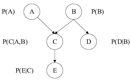 A Bayesian Network is composed of nodes, the directed edges connecting these nodes, and the strength of dependencies between nodes, where the nodes represent variables, the directed edges represent the direct causal relationship between link nodes, and the Conditional Probability Tables (CPTs) assigned to nodes specifies the degree of interaction between link nodes [33,34]. A typical Bayesian Network structure is shown in Figure 3, where node A and node B are root nodes and also the parent nodes of node C, node E is the child node of node C, and node D is the leaf node.
