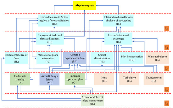 According to Table 3 and Table 4, a multi-level interpretative structural model of risk factors leading to airplane upsets could be drawn, as shown in Figure 4.