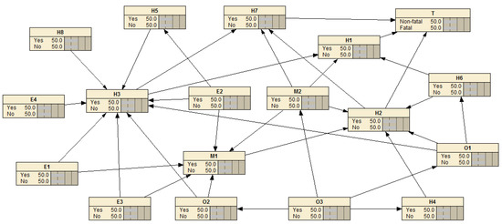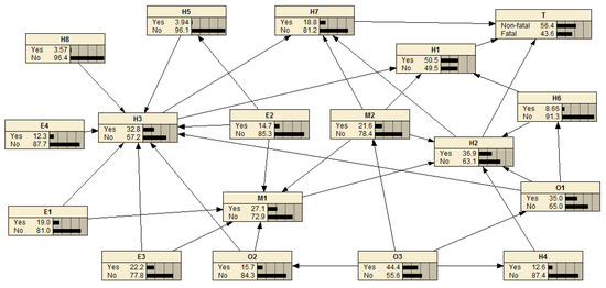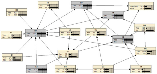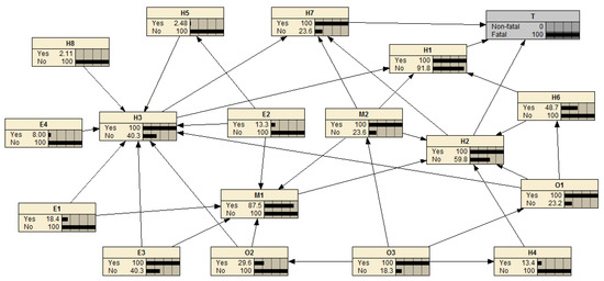 A Bayesian Network can be used as the most probable explanation (MPE) function in the Netica software to identify the risk factor set that is most likely to lead to a specific result [48,49]. To identify the risk factor set that is most likely to lead to airplane upset fatalities, the “fatal” state of node T was set to 100%, and then the “Most Probable Explanation” function in Netica software was used to obtain the results. The results show that the most likely risk factor set is {O3, O1, M2, E3, H1, H2, H3, H7} when an airplane upset fatality occurs, as shown in Figure 10. This conclusion is highly consistent with the current scientific understanding of airplane upset accidents. Therefore, BN’s reverse reasoning ability can provide a scientific basis for the risk management of airplane upsets.