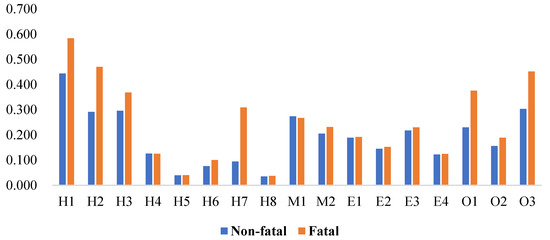 The inference analysis of BN includes causal reasoning (the result is derived from the causes) and diagnostic reasoning (when the result is known, find out the possibility of various causes) [45]. This study mainly uses BN’s bottom-up diagnostic reasoning ability. To this end, we set the values of the two states of node T (non-fatal and fatal) to 100%, respectively, to obtain the posterior probability of each node in the two scenarios, as shown in Figure 8.