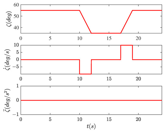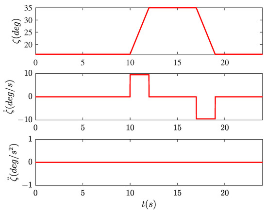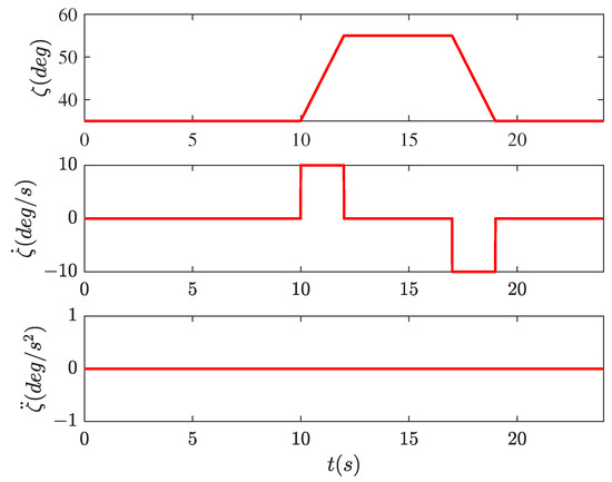 In this subsection, we will compare the size of the reachable sets in the flight path loop between the morphing aircraft and the fixed-geometry aircraft with . To accurately represent the morphing process, it is essential to account for the duration of the shape change. Therefore, we model the dynamic behavior of the morphing mechanism with the following equation: