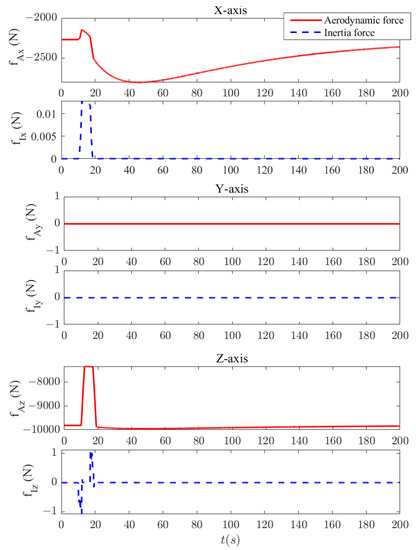 where is the sweep angle, is the dynamic pressure, and is the wing area. , , , , and are aerodynamic coefficients, and they are all functions of the altitude , velocity , and sweep angle . Furthermore, , , and are the components of the inertial force in , and their expressions are obtained using the Kane method [16], which are presented below.
