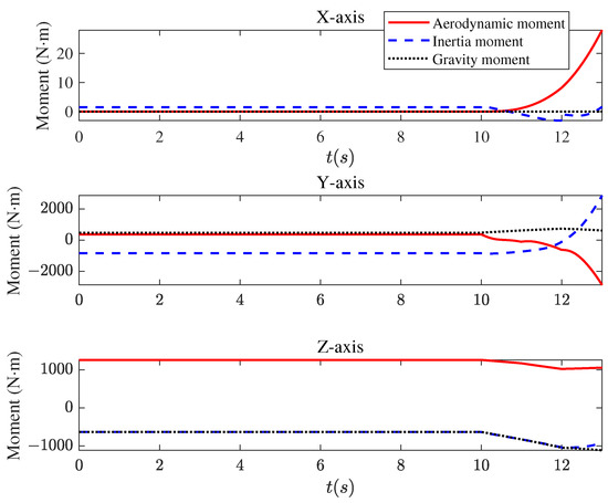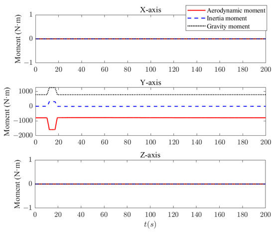 Note that Equation (13) includes and on the right-hand side. These terms are not moved to the left side due to three reasons. First, they are not related to morphing and are also present in the equations of the fixed-geometry aircraft’s attitude loop dynamics. Second, obtaining and using Equation (1) before solving Equation (12) can help avoid any interference during the solving process. Third, moving them to the left-hand side requires matrix inversion and multiplication, resulting in a burdensome algebraic workload.