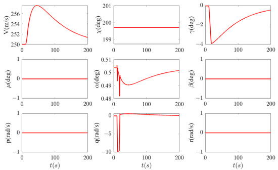 In the previous section, we discussed the response time and maneuverability of the flight path loop without considering the inner loop dynamics. In this section, we will analyze the dynamics of the inner angular rate loop. It is worth noting that the dynamics of the angular velocity loop are still dependent on the outer loop variables, such as , , , and . According to the principle of time-scale separation, the slow outer loop variables can be treated as constants when analyzing the fast inner loop variables. Thus, we set the following parameters for the outer loop: , , , , and . The control inputs for the angular rate loop are , , , and , with constraints set at , , , and .