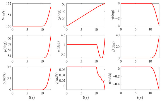 During stable turning flight, only the derivative term on the left-hand side of Equation (13) is constant, while the other terms are set to 0. Similarly, specifying six variables allows for the calculation of the trim point. Let us consider an aircraft with an airspeed of m/s, altitude m, and a turning rate of /s. Given a bank angle of and a yaw angle of , along with a pitch angle of and a sideslip angle of under the steady turning flight condition, we can derive the trim point as