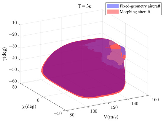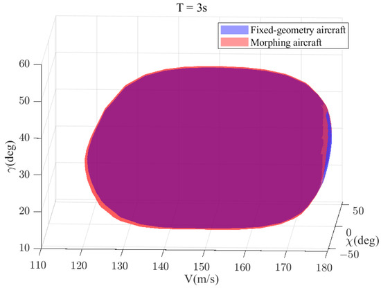 respectively for the reachable set computation, and their sizes reflect the ability of the aircraft to maneuver to the pull-up and dive states. We take the slices of the morphing aircraft’s reachable sets to compare with the fixed-geometry aircraft. The results of the reachable set for s are shown in Figure 11 and Figure 12. It can be seen that the climbing reachable sets of the morphing aircraft roughly exhibit an elliptical cylinder shape, with range from 120 m/s to 180 m/s, range from −50 to 50, and range from 20 to 60 . Meanwhile, the diving reachable sets mainly focus on the region with velocities below the target set, with a smaller size compared to the climbing reachable sets. This is due to the inherent difficulty of reducing velocity during a dive. By counting the number of grid points in the reachable set, we estimate the size of the reachable set for the morphing aircraft in Figure 11 and Figure 12 to be 6.43% and 5.93% larger than that of the conventional configuration aircraft, respectively. This indicates that the morphing aircraft can slightly increase the response speed of the flight path loop by morphing, even if the difference in the response speed of the inner loop is not considered.