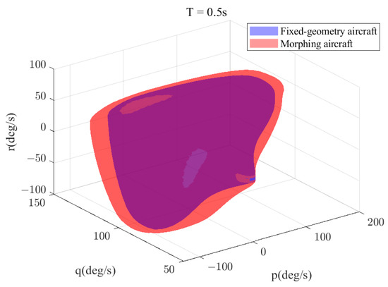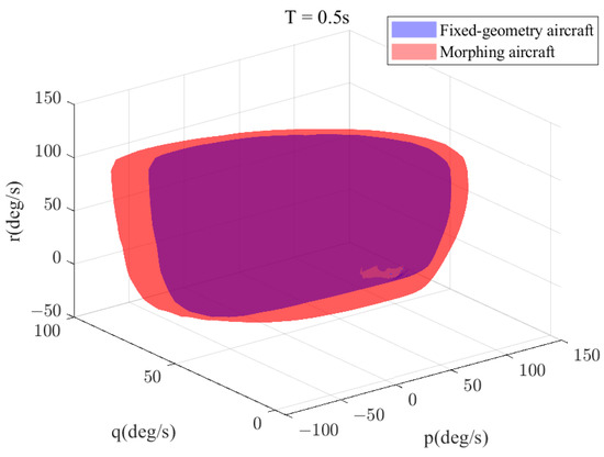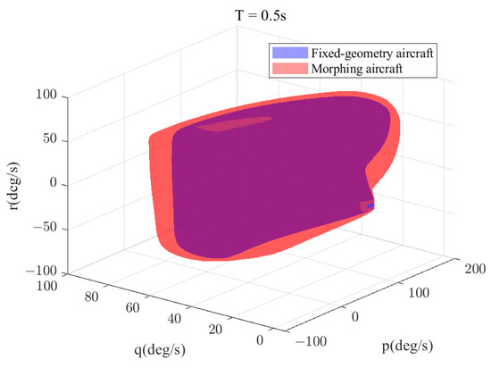 for the computation of the reachable set. The size of these can reflect the maneuvering ability around three axes in the angular rate loop. Take the slices of the morphing aircraft’s reachable sets to compare with that of the fixed-geometry aircraft. The results of the computations for s are given in Figure 13, Figure 14 and Figure 15.