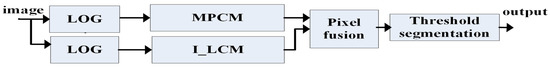 The background includes a large, bulky cloud and buildings. They are highlighted areas and have a high correlation. They occupy the low frequency of the IR image and show violent changes at the edge of the IR image. At the same time, the IR system is uniform in energy. The background demonstrates short-term stationarity and long-term instability. The noise is not correlated with the surrounding pixels and occupies the high-frequency band. They have been recognized as white Gaussian noise with a 0 mean and 1 standard deviation. The target, background, and noise demonstrate different contrast levels. The target shows the discontinuity in the local area. The target is consistent in the local area. However, the noise is utterly different in the local area. The background is also consistent. Within the size of the local area, the local contrast between the target and background is totally different. The algorithm is constructed under the normal DBT procedure. The diagram is described in Figure 2. The algorithm in this paper comprehensively considers the background contour and edge; we carry out LOG on a single-frame image under complex background. Through multi-scale local block anisotropy analysis of small targets, we finally fused the two types of LCM detection effects to identify small infrared targets.