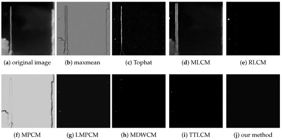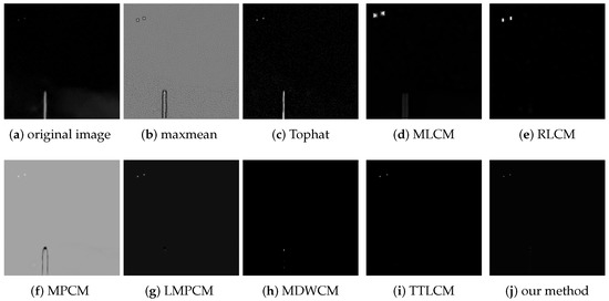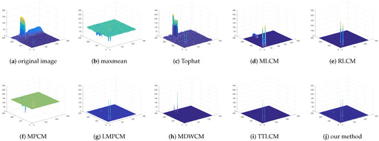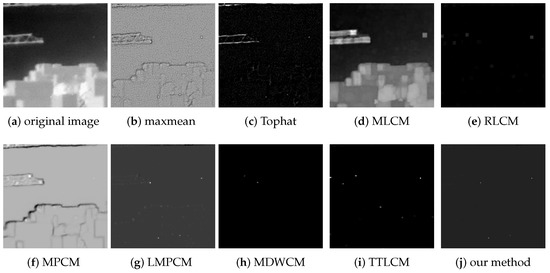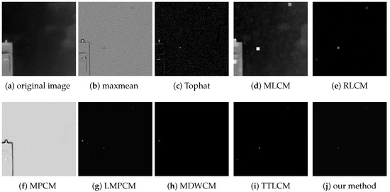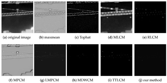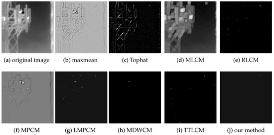 The max-mean filter, Tophat, MLCM, RLCM, MPCM, LMPCM, MDWCM, TTLCM, and our method are used to compare the objective evaluation effect under the complex background image sequences. The SCRG and BSF of the test images are shown in Table 2.