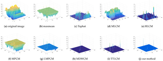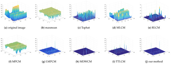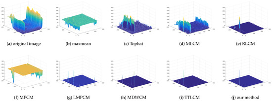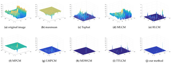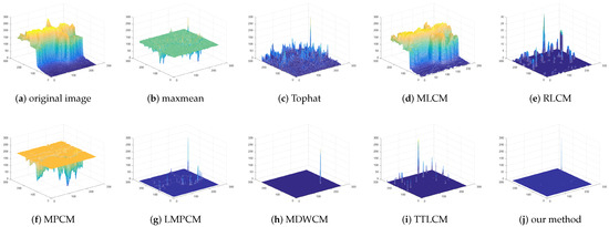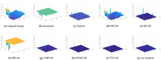 The standard deviation of the multi-scale LOG operator could be set as , , , . The patch size used for multi-scale contrast is . The comparison of the max-mean filter, Tophat, MLCM [7], RLCM [10], MPCM [11], LMPCM [14], MDWCM [18], TTLCM [19] and our method is shown in Figure 6 for the image . The 3D mesh results of all methods are displayed in Figure 7 for the image . The detection results and 3D mesh results of image are in Figure 8 and Figure 9. Figure 10 and Figure 11 are for image . Figure 12 and Figure 13 are for image . Figure 14 and Figure 15 are for image . Figure 16 and Figure 17 are for image . Figure 18 and Figure 19 are for image . Figure 20 and Figure 21 are for image .