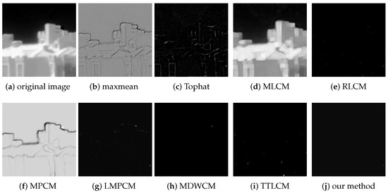 Combining two contrast results, the Hadamard product operation completes the pixel-level image fusion. Furthermore the image is normalized based on the non-uniform contrast in the local block. The median contrast could further enhance the target and suppress the bright background edges and local points of convergence with a lower false alarm rate. The final fusion result is . The 3D image of the fusion shows that the result accurately locates the small target, allowing for a higher detection rate under the same false alarm rate with threshold segmentation. As shown in Figure 5, bright buildings and strip backgrounds exist. After using the non-consistent contrast based on local blocks, the target and corner points are enhanced. The strip area and edge intensity decrease. Simultaneously, we calculate the local contrast of the image based on the median operation, and the bright corners of the building background are greatly reduced. After pixel-level fusion, we obtain the saliency map. The continuous highlight background is removed, as are the highlighted corners and stripes. The target enhancement and background suppression effects are significant. As you see, the improved LCM based on LOG effectively removed highlight corners. The fusion algorithm includes the following steps: