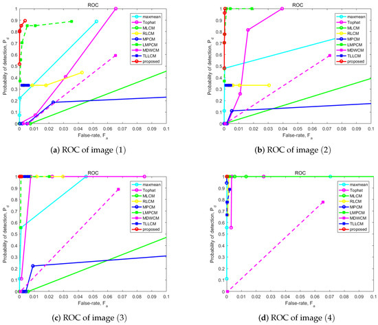 The ROC curve is composed of the detection rate and the false alarm rate. The detection rate is defined as the ratio of the number of real targets’ pixels detected to the number of targets’ pixels in frame sequences, as shown in (10).