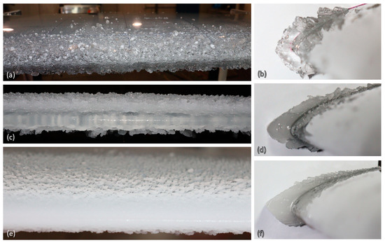 The testing procedure begins with running the icing wind tunnel for the chosen ice accretion time. Afterward, the airfoil is carefully removed from the testing position to allow for better access, and the resulting iced leading edge is photo-documented in order to capture the ice’s physical properties, such as opacity, irregularities, and specific ice formations. Exemplary frontal images of the leading-edge ice formations for glaze, mixed, and rime regimes are illustrated in Figure 2a,c,e together with their corresponding side views in Figure 2b,d,f. Later, these are further used to extract the 2D ice profiles with one of the developed measurement techniques.