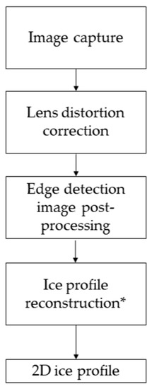 Edge detection image processing (IP) method flowchart detailing the main steps to obtaining continuous-line 2D ice profiles. The * marks the optional steps of the process. The ice profile reconstruction is optional and is meant to be used when continuous-line profiles are required. The results presented in Section 3 are generated with only the first three steps of this process.
