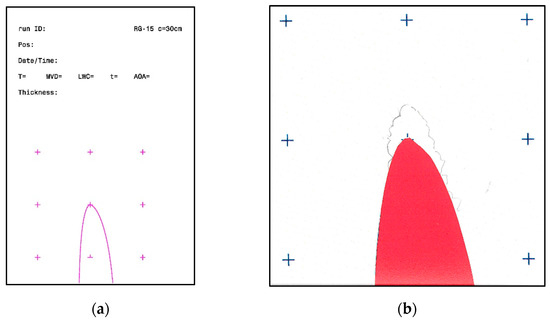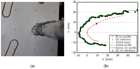 The first step is to take a manual tracing of the ice shape. Manual tracing was the most common method used to obtain information about ice shapes in the past [22,23,24]. First, a clean cut is made in the ice using a heated aluminum plate with a cut-out of the airfoil shape. Then, a paper template is fixed on this aluminum plate and put in the gap in the ice. The ice is traced manually on the paper template using a pencil. An exemplary resulting tracing is shown in Figure 11b. The paper sheet used for this study had a header to insert run-specific information like the run number, the conditions, and the position of the tracing on the wing in a spanwise direction. This information helps one to connect the different tracings with the runs and spanwise positions. Another feature of the paper sheets was that eight red crosses were placed with some distance between them and the airfoil (see Figure 11a). Adding these crosses allows for scaling the results to the original size in the end, independent of possible scaling issues while scanning the tracing or conducting post-processing on the tracing.