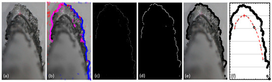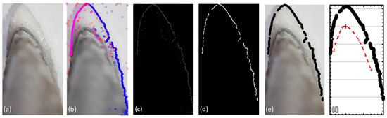 Next, the image is cropped to the region of interest (ROI), as is shown in Figure 6a, in which the user signals the leading-edge reference point (which is visible in this case) while the algorithm illustrates it (the magenta cross) and retains its position.