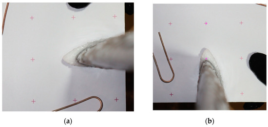 In this case, it can be seen that, although the predicted LE reference falls on the same line with the lateral calibration signs, the reference point is higher than the airfoil’s LE (visible in Figure 8a and the comparison between Figure 8e,f). This is a case in which the calibration paper is slightly misaligned, which generates a very similar percentual error with both techniques when compared to the caliper measurement. Therefore, this step can be useful also for identifying misalignment errors.
