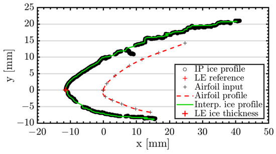 Finally, the scaling is applied, and the ice profile is retrieved in millimeters. In order to compute the leading-edge ice thickness, the ice profile is interpolated to find the thickness value corresponding to the LE reference point (yLE = 0). To check for accuracy, this value is compared to the caliper measurement. As the detected ice profile might have gaps due to the filters applied, a profile reconstruction step based on a built-in MATLAB interpolation function is used to generate a continuous-line ice profile (green line in Figure 5b). However, because losses of accuracy might occur in this step, the use of the reconstructed profile is advised only in applications where an approximate ice shape is suitable. For cases with low-quality images (those with significant shadows or light reflections; see Section 3.2) which generate large gaps in the detected ice profile, the reconstruction step should be avoided. In these cases, the interpolation method will generate faulty profiles (see Appendix A, Figure A1). To include the difficult cases in the analysis of the IP technique, only the detected ice profiles are presented in this work. Good practices for maximizing the accuracy and the completeness of the detected profiles using the IP method are presented in Section 4.