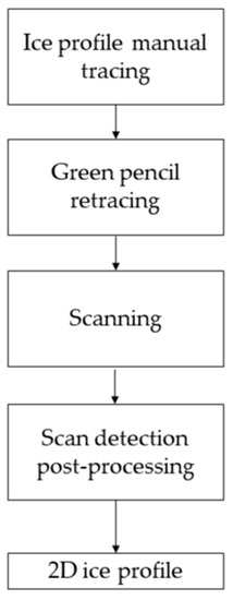 The idea behind the scan detection method is to take a manual tracing of the ice shape, scan the tracing, and use an algorithm to digitize the ice shape. Its main process steps are illustrated in Figure 10. It should be noted that the scan detection method is not completely novel but is an improvement to manual tracings because it uses an automatized post-processing algorithm.
