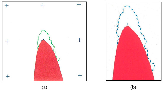 Estimation of measuring paper misalignment for run 231L: (a) the scanned drawing of the ice shape profile, which is the (a) raw data for the SD technique is compared with (b) the experimental image, which is the raw data for the IP technique. Straight interrupted lines mark the drawings’ important features (alignment cross, maximum ice thickness, and LE reference point) and connect them with their image equivalents. The orange segments mark the difference between the LE reference and the maximum ice thickness for both techniques. The observed orange segments’ size, despite the connected alignment crosses, shows the paper’s misalignment for the manual drawing.