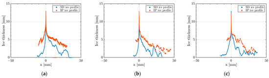 Leading edge detail of the 1D ice profile of the airfoil’s length (T = −4 °C, mixed ice) obtained by converting the 2D profiles generated by the image processing (IP) and the scan detection (SD) techniques for (a) run 14, (b) run 15, and (c) run 23.