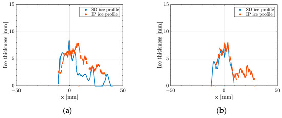 Three types of results are presented in this section, always comparing the data generated by the two 2D ice profile measurement techniques—the image processing (IP) and the scan detection (SD) methods. First, a quantitative result of the leading-edge ice thickness is used to validate the methods against caliper-measured experimental data. Secondly, a qualitative 2D ice profile comparison is conducted. As both techniques have their possible sources of error, this qualitative investigation cannot be considered a validation against an exact shape. However, a good agreement between the profiles of both techniques is considered a satisfactory result. Lastly, aiming for a simplified comparison of the two techniques, and between all the cases (regardless of the ice accretion regime, testing conditions, or airfoil shape) the 2D ice profiles are converted and compared in terms of 1D ice thickness profiles. Besides these, experimental observations about the ice accretion regimes are discussed—as the ice’s physical properties change (optical aspect, roughness-level of detail, shape, etc.).