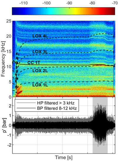 Figure 1. Spectrogram of unsteady pressure records and sequence diagram of BKD campaign; a gray region denotes the unstable condition. Modified and reprinted with permission from [3] © 2019 by Wolfgang Armbruster, Justin S. Hardi, Dmitry Suslov, and Michael Oschwald.