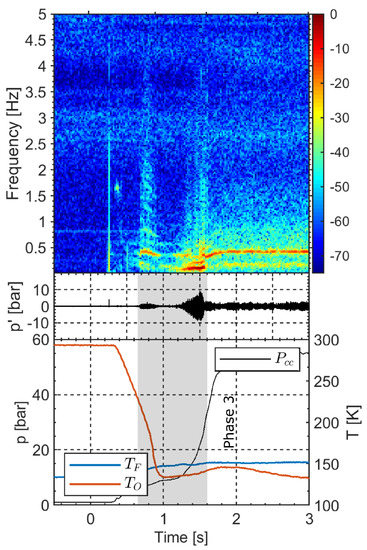 Figure 2. Spectrogram of unsteady pressure records and test sequence diagram of LUMEN campaign; a gray region denotes the unstable condition. Modified and reprinted with permission from [6] © 2020 by Justin S. Hardi, Jan Martin, Min Son, Wolfgang Armbruster, Jan Deeken, Dmitry Suslov, and Michael Oschwald.