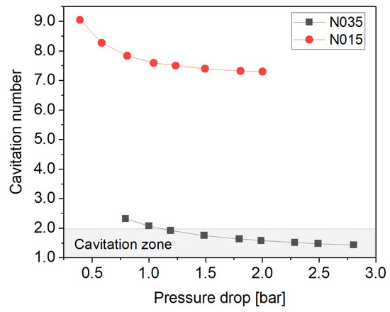 Cavitation inception is expected to occur at cavitation numbers from 1.8 to 2.2, according to the diameter ratio of the orifice to the downstream tube [28]. When the N015 nozzle is used, the global cavitation numbers at all pressure drop conditions are much higher than 2.0, as shown in Figure 5, whereas the global cavitation numbers with the N035 enter the potentially cavitating ranges below 2.0.