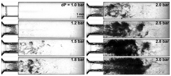 When the pressure drop increases from zero bar with the N035 nozzle, the cavitation is initiated quickly at 0.8–0.9 bar, and then the stable bubbly flow is maintained with a 1.0-bar pressure drop at the edge of the orifice inlet with small nucleation bubbles, as shown in Figure 6. At a 1.0-bar pressure drop the cavitation number is 2.07, which is similar to the cavitation limit of 2.05 in the study by Yan and Thorpe [28] for an orifice diameter ratio of 0.56. The bubble length grows with the increasing pressure drop up to 1.2 bar, corresponding to a cavitation number of 1.91, but the bubbles vanish before reaching the orifice outlet. When the pressure drop is higher than 1.2 bar, the cavitation bubbles are released into the injector tube across the orifice outlet, which generates the bubble clouds.