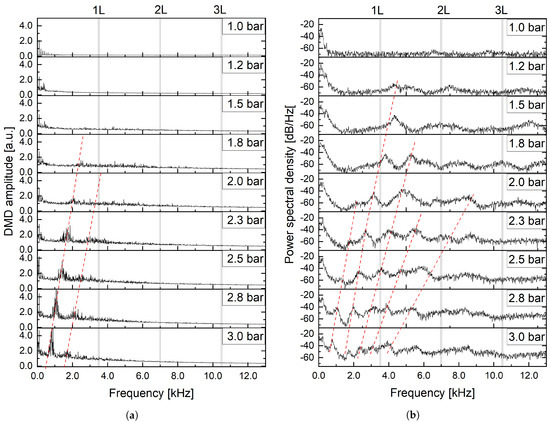 Second, the pressure peaks have multiple harmonics. This characteristic can be also observed from the hot-fire test records, as shown in Figure 2. The presence of multiple harmonics over a wide range of frequencies increases the chances of coupling with resonance of other components, such as combustion chamber acoustic modes. The red dashed lines in Figure 7a are matched with the first two lines in Figure 7b. The secondary pressure peak marked by the second red dashed line in Figure 7b is already excited at the pressure drop of 1.2 bar, though the bubble clouds do not yet extend past the orifice outlet (Figure 6). This means that the secondary peaks do not originate from the bubble clouds. In contrast, the primary pressure peak arises later than the DMD peak when the pressure drop reaches 2.3 bar. This means that the primary peak is more likely related to the bubble clouds exhausted from the orifice. This characteristic can be analyzed further using the DMD spatial modes.