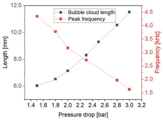 Figure 9. Comparison of bubble-cloud lengths and peak frequencies of unsteady pressures at pressure drops.