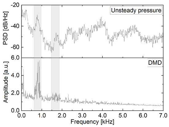 Figure 10. Spectra of unsteady pressure and DMD mode at d P = 3.0 bar.