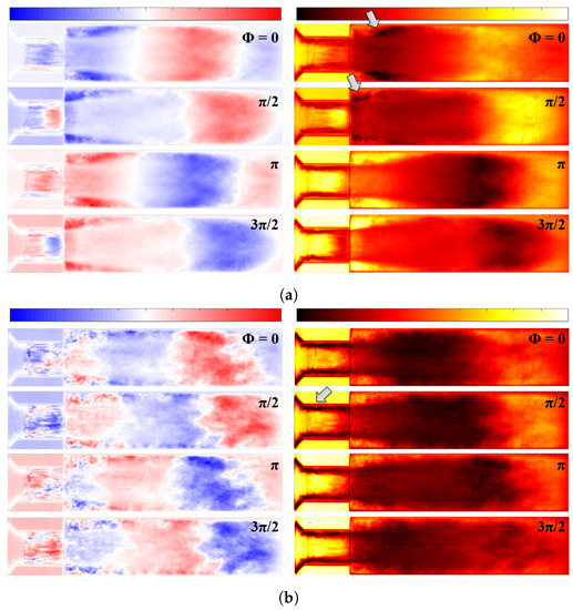 The bubble clouds fluctuate in the longitudinal direction, which can deliver the pressure oscillation downstream. The 880- Hz fluctuation is strongest, including the inner orifice flow, as shown in Figure 11a. When we see the spatial mode in the orifice, the entire flow resonates with the injected bubble clouds, and the position of the recirculation zone at the step after the orifice is also modulated. Because of the early detached flow at the orifice wall, lots of bubbles are generated inside the orifice, and they make the image blur at Φ = 0 . Afterwards, the bubbles are strongly injected into the shear layer of the bubble jet, as the arrow designates. Then, the bubbles return back to the orifice side due to the recirculation at ϕ = π / 2 , while the main bubble jet starts to stretch. Simultaneously, the detached boundary layer inside the orifice becomes stable. At ϕ = π , the bubble clouds still stretch and the boundary layer at the orifice wall becomes unstable from the orifice outlet. The bubble cloud stretches to the maximum extent at ϕ = 3 π / 2 , and begins the collapsing phase due to the pressure recovery escaping the vena contracta as the boundary layer detaches further. This mode has the lowest frequency because the flow resonates along the whole length of the bubble clouds.