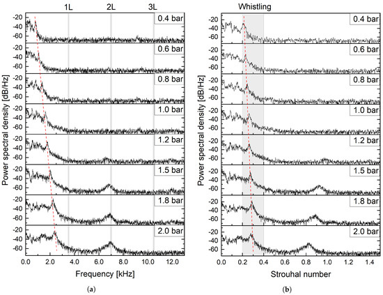 Figure 12. Spectra of unsteady pressures of non-cavitating flow. The red dashed lines indicate the trend of changing peak frequencies within the whistling range. (a) Power spectral density vs. frequency. (b) Power spectral density vs. Strouhal number.