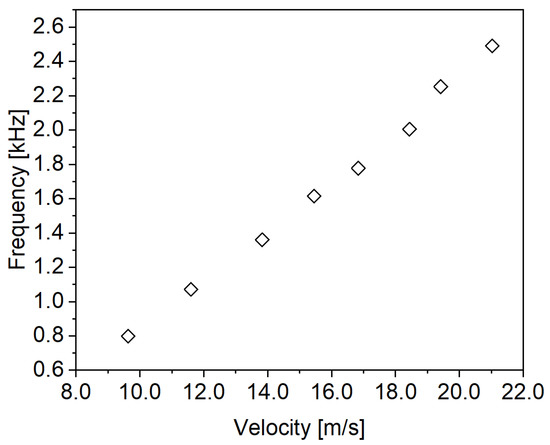 Whereas the bubble cloud length affects the excitation frequency in the cavitating flow, as described before, it seems the orifice flow velocity is the more relevant factor for the excitation from the non-cavitating flow, as shown in Figure 13. The orifice flow velocity is calculated based on the measured flow rates, the assumed water density, 1000 k g   m 3 , and the orifice area. The primary peak frequency is directly proportional to the orifice flow velocity. According to the CFD results presented by Son et al. [21], the boundary flow inside the orifice exhibited flapping behavior under non-cavitating flow conditions. This indicates that as the flow velocity through the orifice increases, the flapping speed of the boundary flow at the orifice wall also increases. As shown in Figure 12b, this characteristic can be normalized by the definition of the Strouhal number, which is defined as Equation (14), where the frequency from Equation (1) is replaced by the flow spectral frequency f f l o w from the pressure spectra. As a result, the primary peaks are observed in the range of typical whistling Strouhal numbers (0.2–0.4) [18,19].
