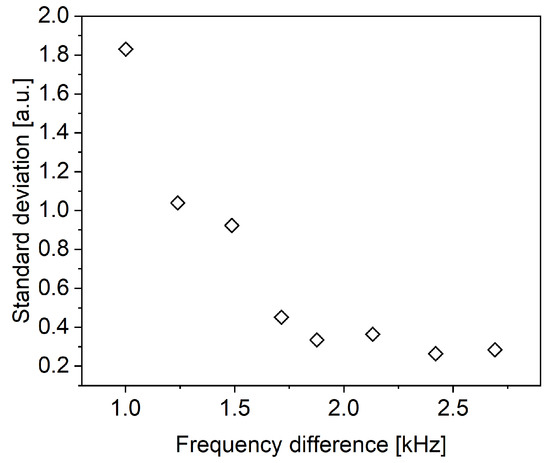 Figure 14. Standard deviations of filtered pressures at 6.0–8.0 k Hz according to differences between 1L mode frequencies and primary frequencies.