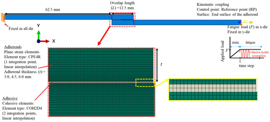 Specifications of the 2D FE model of the SLJ under fatigue tensile loading.