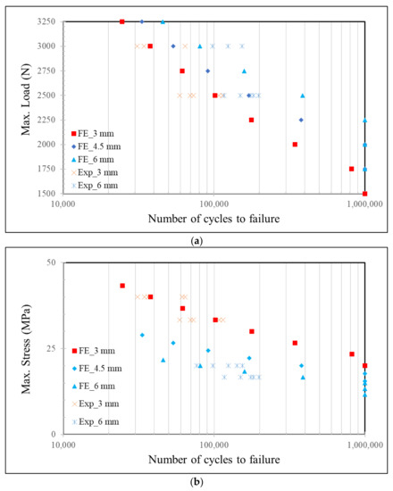 The numerically obtained number of cycles to failure from the SLJs depending on the amount of load applied (ranging from 3250 N to 1500 N with 250 N decrement) as well as the corresponding stresses applied (ranging from 43.33 MPa to 13.33 MPa) for different adherend thicknesses (3 mm, 4.5 mm and 6 mm) were shown in Figure 2a,b, respectively. Table 2 demonstrates the respective number of failure cycles. The experimental values taken from Ref. [11] were also presented in both figures. They were for 3 mm and 6 mm adherend thicknesses with 3000 N and 2500 N loads with the corresponding stresses applied. Overall, a judiciously good agreement of the experiments and simulations was achieved. Only, for the thicker adherends subjected to 2500 N load, the experimentally obtained failure cycles, ranging from 117,059 to 198,275, were less than the numerically predicted one, 386,850 cycles.