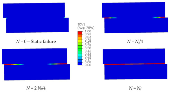 Figure 3 presents the distribution of the damage variable on the adhesive layer upon the static loading applied and at different fatigue cycles, namely Nf/4, 2 Nf/4 and Nf for 3.0 mm adherend thickness and 3250 N fatigue load. As the stresses reached their peaks at the both ends of the adhesive layer upon the static loading applied at the beginning, the damage started in these regions (see Figure 3). Over the course of fatigue loading, the damage started to propagate, i.e., the crack began to spread evenly from the edges of the adhesive layer towards its center. After a certain number of failure cycles, all parts of the adhesive layer were damaged (Figure 3).