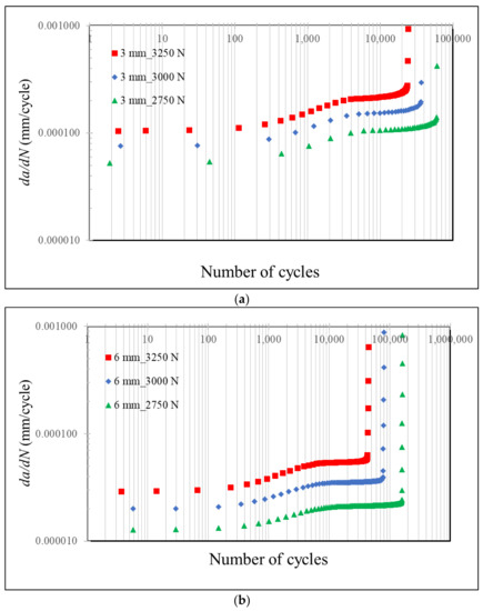 da/dN vs. number of cycles for the SLJ exposed to 2750 N, 3000 N and 3250 N loads for adherend thicknesses of 3.0 mm (a) and 6.0 mm (b).