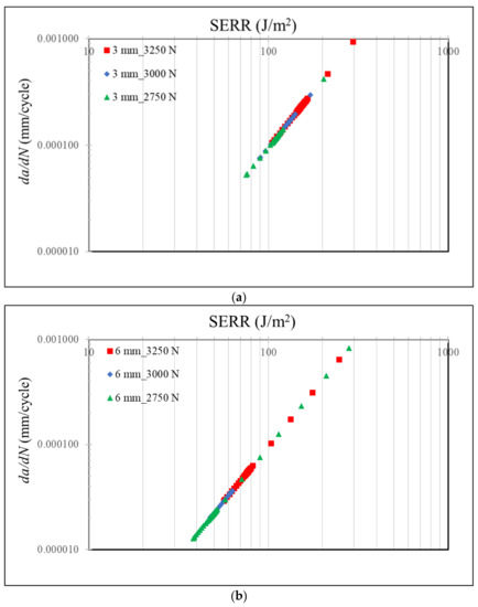 da/dN vs. SERR for the SLJ exposed to 2750 N, 3000 N and 3250 N loads for adherend thicknesses of 3.0 mm (a) and 6.0 mm (b).