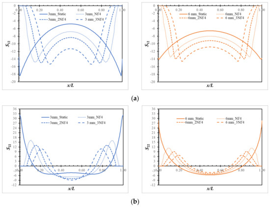 Plot of stress components S12 (a) and S22 (b) (in MPa) along the overlap length for the SLJs exposed to 2750 N load for adherend thicknesses of 3.0 mm (left) and 6.0 mm (right).